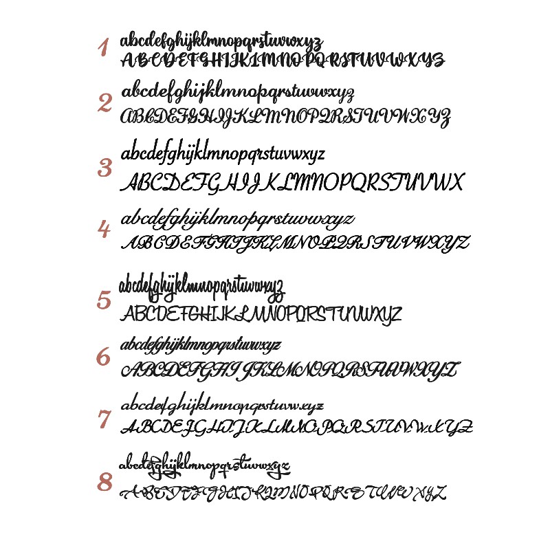 - 8 écritures au choix : le modèle vous sera envoyé avant fabrication pour confirmation.